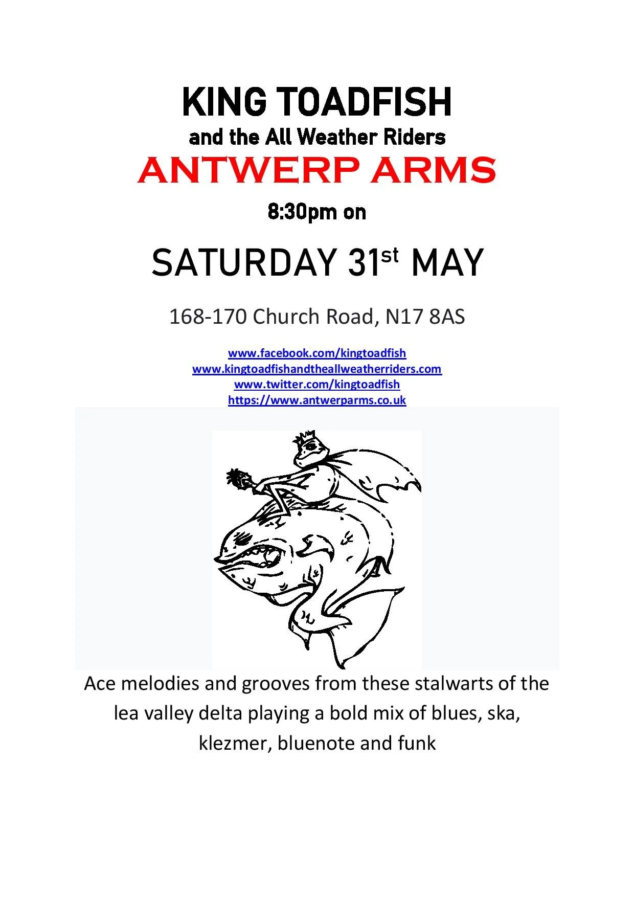 King Toadfish and the All-Weather Riders are a long-established band playing a joyful mix of ska, blues, jazz, klezmer and beyond, in pubs and clubs in north and east London. We have 9-10 core members, but are also available for private functions as a smaller unit. Scroll down past clips and news items for details of upcoming gigs.