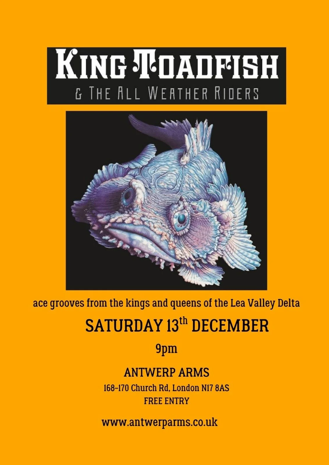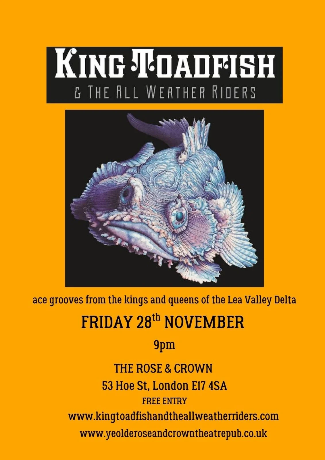 King Toadfish and the All-Weather Riders are a long-established band playing a joyful mix of ska, blues, jazz, klezmer and beyond, in pubs and clubs in north and east London. We have 9-10 core members, but are also available for private functions as a smaller unit. Upcoming gig details listed below.